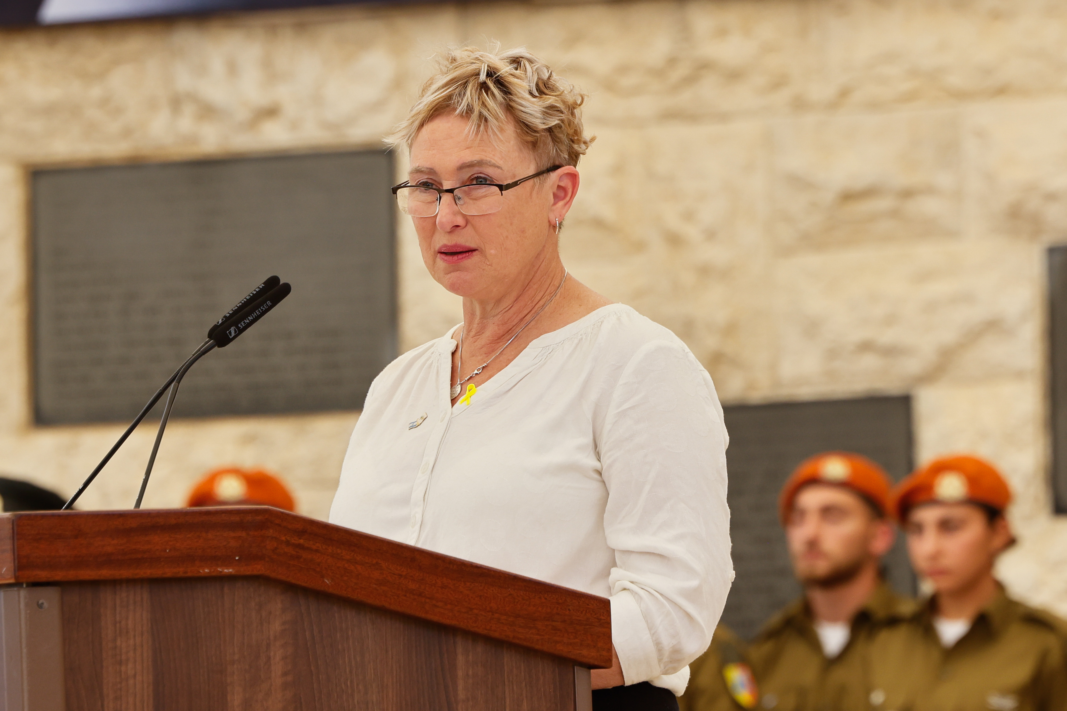 Iris Haim spreekt tijdens een nationale herdenkingsceremonie voor de burgers die werden vermoord tijdens het bloedbad van 7 oktober. | Foto: Marc Israel Sellem/POOL.