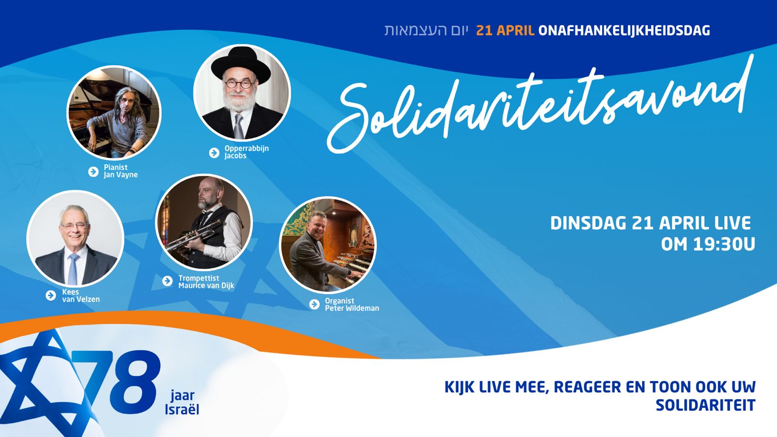 Wat is er mooier dan met een zaal vol vrienden zingen tot eer van de God van Israël? Dit jaar bestaat Israël 78 jaar. Op dinsdag 21 april om 19.30 uur staan we stil bij deze mijlpaal, met een grote solidariteitsavond. Dat doen we met samenzang, Israëlische muziek, Bijbelstudie, ontmoeting en interessante sprekers uit binnen- en buitenland. Kijk live mee en laat weten dat Israël en de Joodse gemeenschap niet alleen staat.
