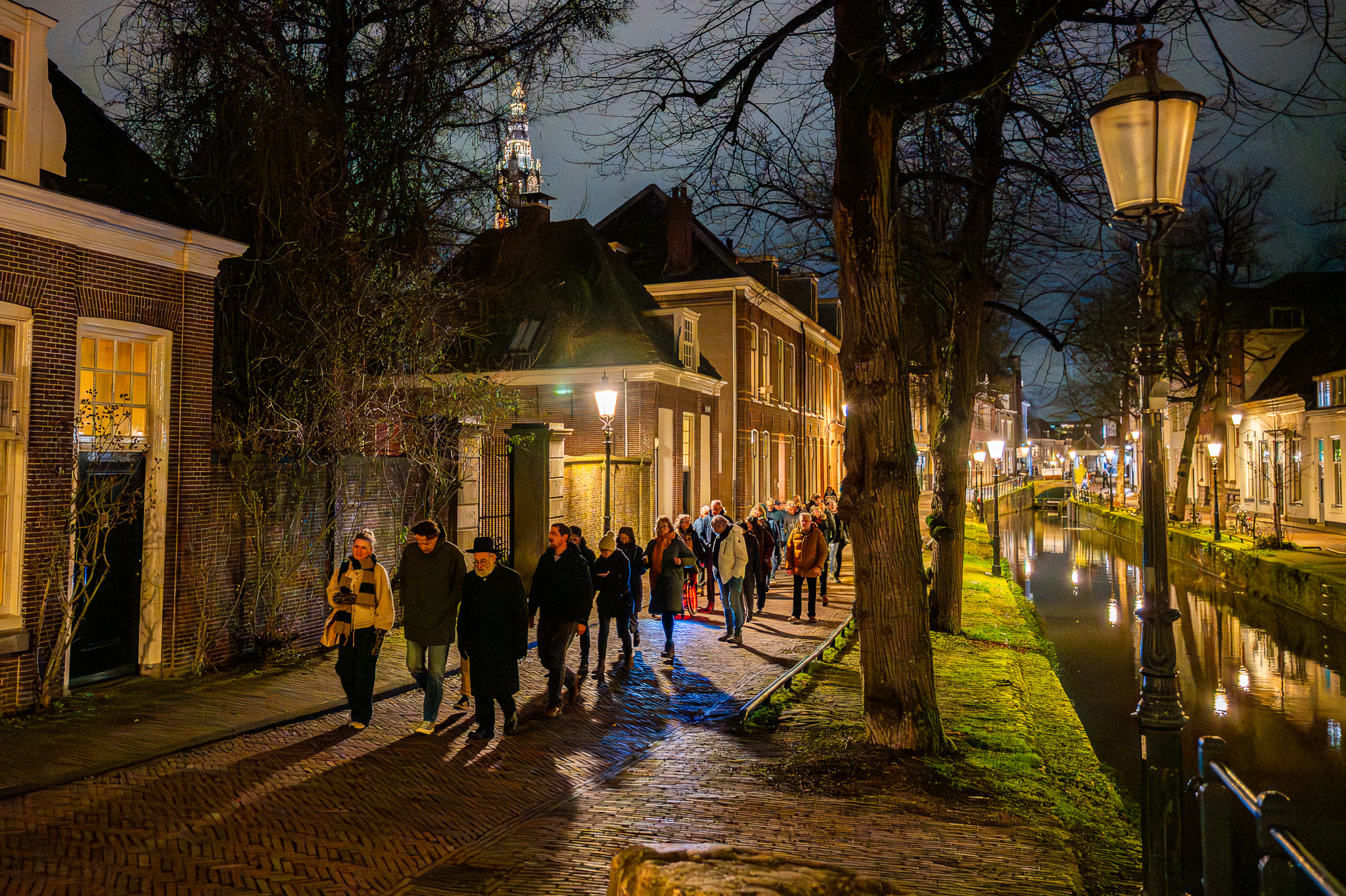 De route voert door smalle steegjes en over met kinderkopjes geplaveide pleinen. We lopen onder de Onze Lieve Vrouwetoren door en passeren de Sint-Joriskerk. De kerkklokken kondigen het hele uur aan als we uiteindelijk in de smalle steeg voor de synagoge belanden. Opnieuw neemt Schermers het woord. Met luide stem leest hij Psalm 121. Elke regel wordt herhaald door de groep. Maar voordat de woorden uit dit welbekende pelgrimslied klinken, draaien de mensen zich richting het oosten, naar Jeruzalem. Dan klinkt uit tientallen monden: “De Eeuwige is uw Bewaarder. De Eeuwige is uw schaduw aan uw rechterhand (…) Hij zal u bewaren voor alle kwaad, uw ziel zal Hij bewaren.” De woorden van gebed en zegen lossen weer op in het donkere van de avond, maar niet voordat de Eeuwige ze zelf gehoord heeft.